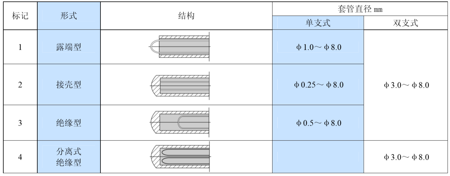 2、鎧裝熱電偶的常用使用溫度及分度號
